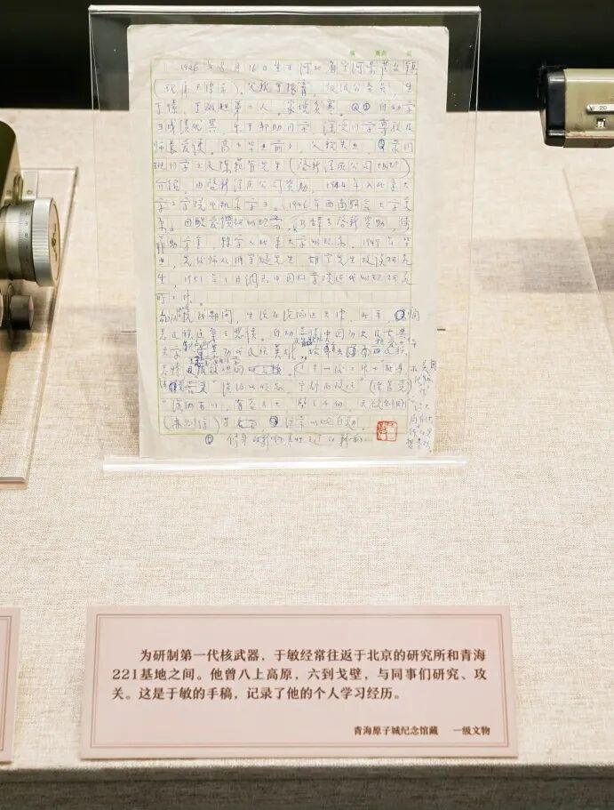 展览聚焦青海省海北州金银滩,精心遴选69件/套文物,包括于敏的手稿、邓稼先的履历表、第一颗原子弹爆炸时使用的程序时间指示器、手摇计算机等数件国家一、二级文物,以及反映中国核工业发展史、国营二二一厂厂史的珍贵历史文献资料。